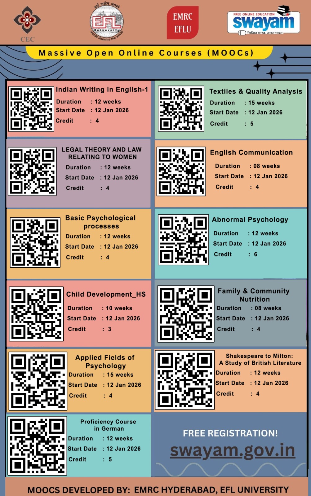 To date, EMRC-EFLU has offered 91 MOOCs across various subjects. Each MOOC is structured with varying numbers of credits, resulting in the development